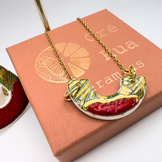 Mini Arc Necklace - Green Gingko print, Red & 24 carat gold
