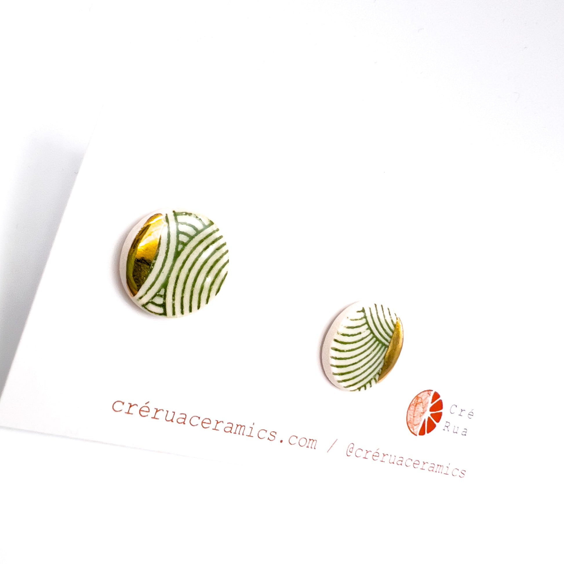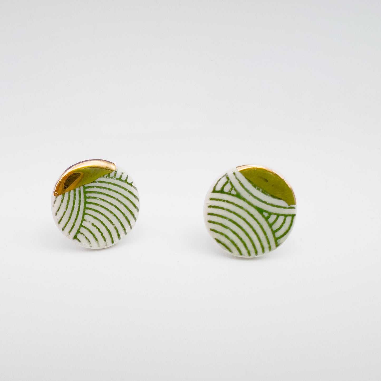 White Earthenware clay decorated with a sea green glaze, green wavy print & 24-carat gold lustre. Stainless steel hypoallergenic stud.